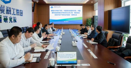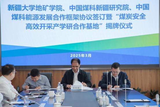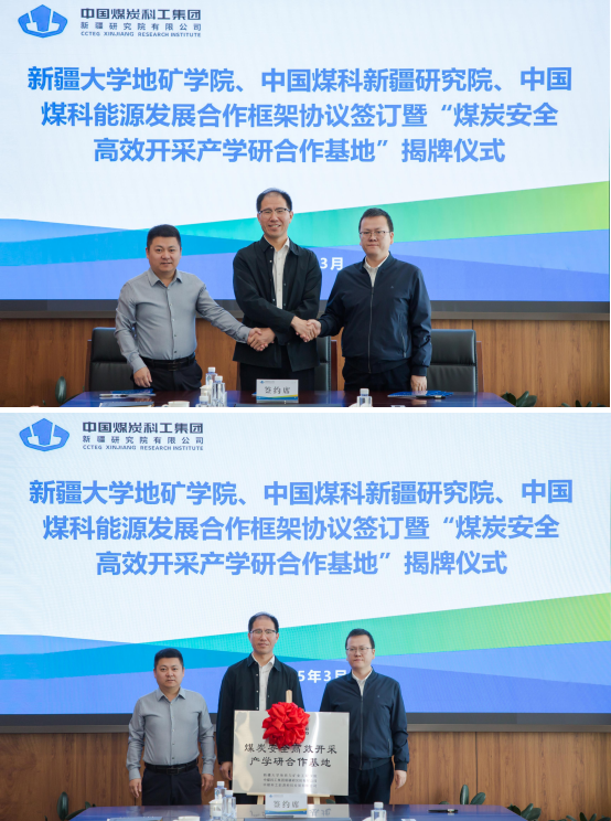 、中国煤科新疆研 究院、中国煤科能源发展有限公司三方代表共同签订发展合 作框架协议,并进行“煤炭安全高效开采产学研合作基地”揭牌仪式。