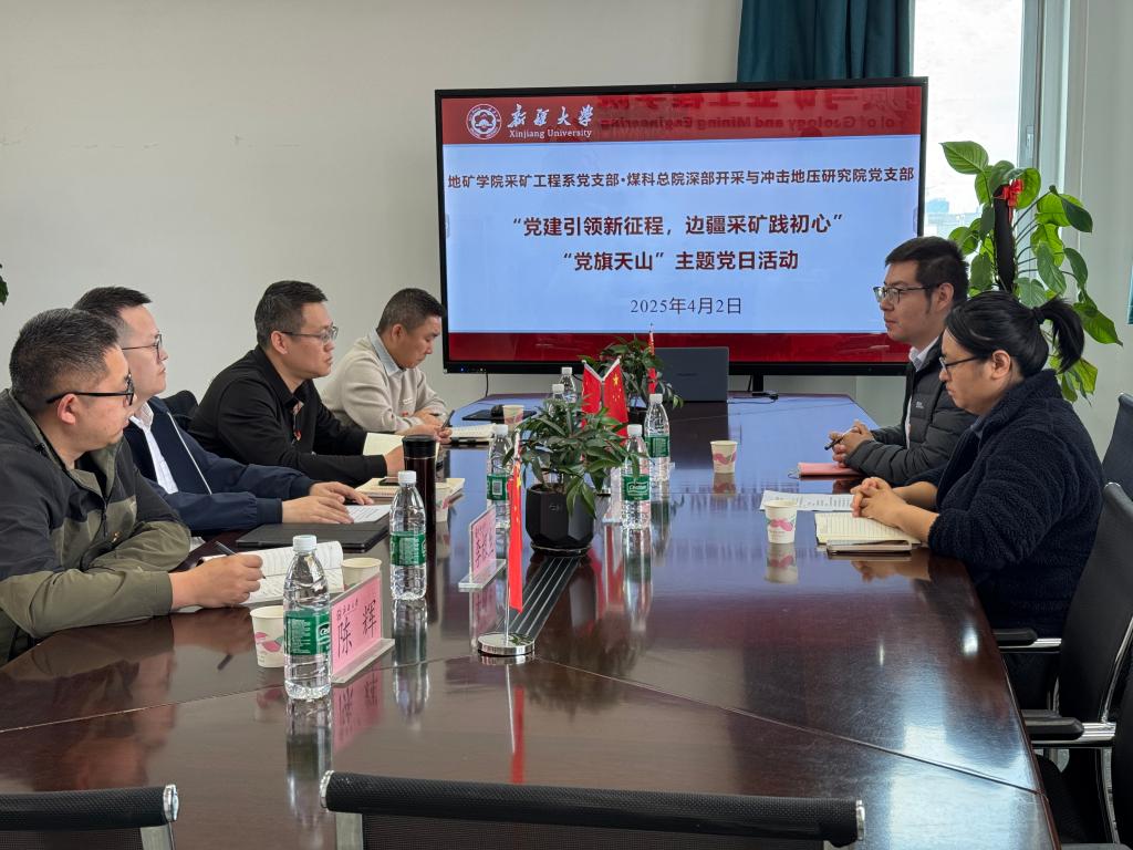 采矿工程系党支部开展 “ 党建引领新征程 边疆采矿践初心 ”“ 党旗映天山 ” 主题党日活动。 此次活动特邀 煤炭科学研究总院深部开采与冲击地压研究院 负责人 杨冠宇 及 其 深地实验室负责人石晓闪 参加 ,采矿工程系党支部书记管伟明、 支部 委员及 支部党员 参加活动。